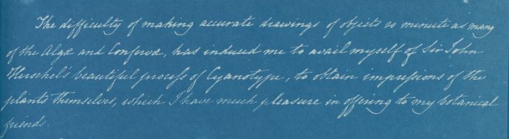“The difficulty of making accurate drawings of objects so minute as many of the Algae and Confervae has induced me to avail myself of Sir John Herschel's beautiful process of cyanotype to obtain impressions of the plants themselves, which I have much pleasure in offering to my botanical friends."