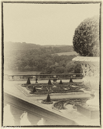 The photo above is one I took at Harewood House, looking down on the newly restored parterre and onto the lake. I’ve processed it in an old style to emphasise repetition and continuity because, back in 1859, Roger Fenton stood in exactly the same place and took exactly the same photo, recording an earlier refurbishment, at the time when the house was remodelled.