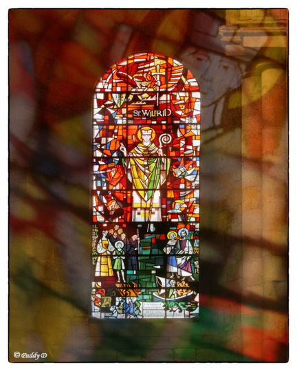 So, the first stage of post-processing was to correct this distortion and make the window look more regular (and it also had the side-effect of making St. Wilfrid seem lower down, and hence more accessible); then I cropped away extraneous distractions, the stonework and the paintings; next I brightened and enhanced the colours. And finally, I enlarged a small section of the window – focussing on St. Wilfrid’s face – and overlaid it on the image.