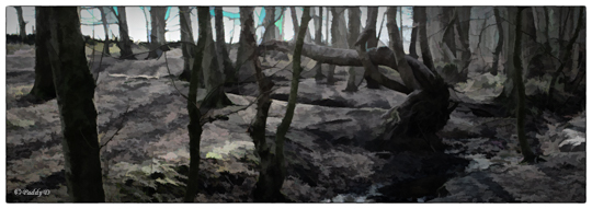 Looking at the other photographs I took on the same day, on the same walk – on that blue-sky, February morning – you can see the silhouettes of trees, captured contre-jour; shapes and shadows; reflections on the water in Peter’s Pond; all re-creating our upbeat and jaunty mood. Yet, when we stood at this edge of the wood, our experience changed; we both saw a very different scene – unexpected but familiar; a scene that we both recognised from 1914-18 war art – a shattered tree stump, a fallen tree, a ditch, perhaps a trench; a scene which was strangely detached from reality and the outskirts of Leeds in 2019.