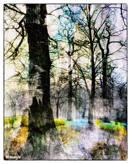 It was taken in Roundhay Park, looking south through a stand of trees on a bright winter's day – the sun casting long, raking shadows towards us. And those memories of 'then' set an upbeat mood to the style I've adopted for the image – our pleasure and optimism transferred into blues and yellows, a splash of green. But, of course the ‘now’ is very different; our feelings are confused; we're uncertain and uneasy – so that lack of clarity is reflected in the image too.