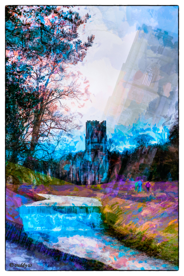 I had created the image alongside after Kate died, remembering the last workshop she ran at Fountains Abbey, the last time we saw her. And I wanted to work on something new which celebrates the good things in life; the smiles and laughter at that workshop; the 40 years of memories Ian and I have vested there.