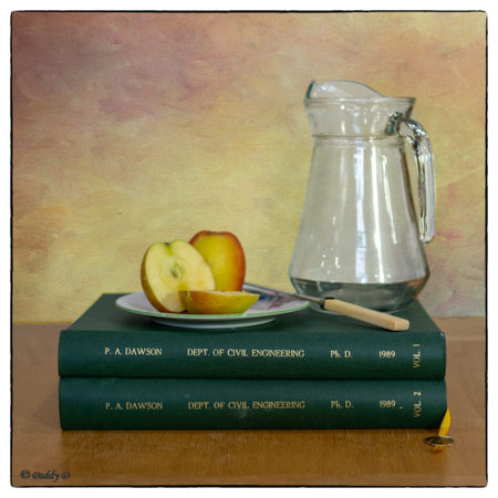 I aimed to juxtapose our lives by replacing her setting, of a chopping board, with the two volumes of my university thesis in my still life ‘Opportunities’.