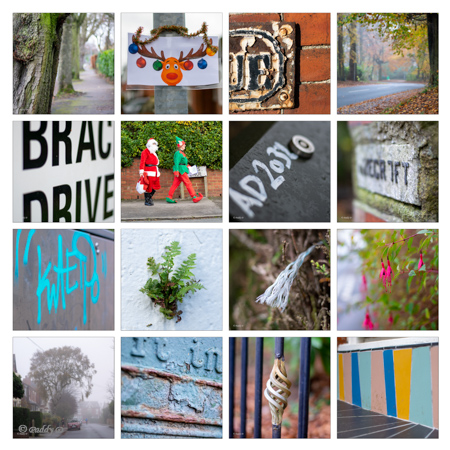 Instead of feeling frustrated that I couldn't point the camera (I didn't have one with me), I pointed Ian at everything I’d photographed locally, since starting Ruth’s course. That’s the corner where I saw Santa and his elf, that’s the avenue of trees, that’s the reindeer-sign, that’s the ornamental railing, that’s the colourful doorstep, that's the little fern, that’s ....